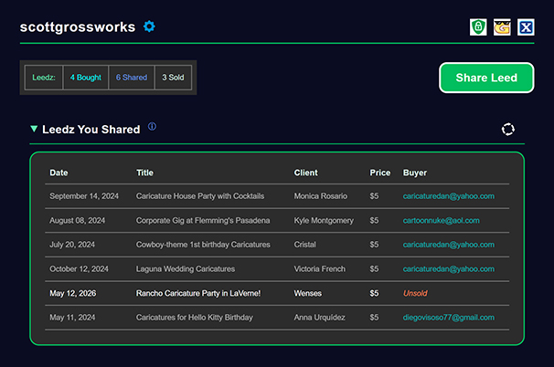 The Leedz is a marketplace to share Bookings with your friends, or sell the info to other vendors.